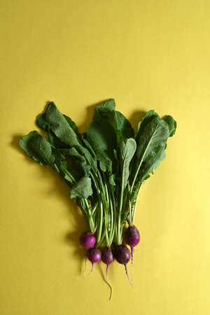 Freshly plucked mature radish on a yellow background. The concept of growing radishes.