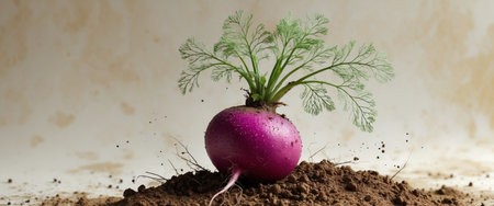 AI Generated. Freshly dug purple plum radish with vibrant skin covered in soil on dirt bed