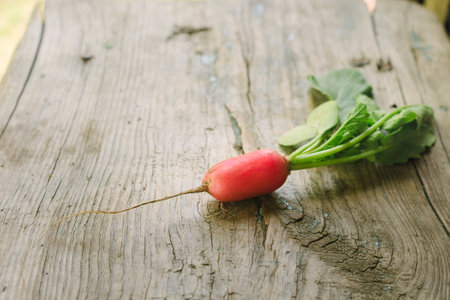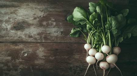 Fresh radishes with vibrant greens on a rustic wooden background showcase the beauty of organic produce, perfect for culinary themes and health-focused content.
