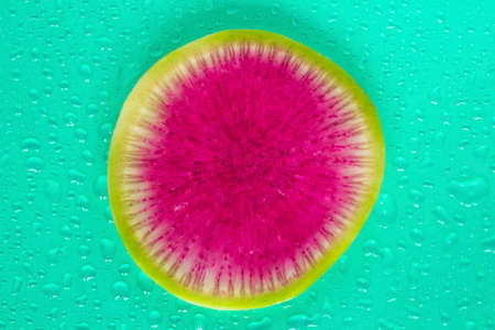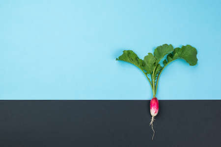 Fresh radish with leaves on a black and blue background. The concept of growing radishes.