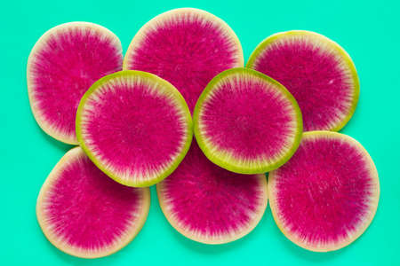 Pink, red, dark red, purple, and white radish vegetable over white background