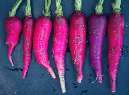 Three fresh radish plants on a black and blue background. The concept of growing radishes.