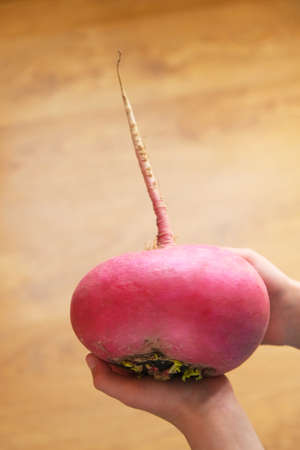 Ripe red radish in strong male hands. Funny, abnormal vegetable or food waste concept. Healthy organic vegetables. Natural vitamins, food raw materials. Vertical photo.
