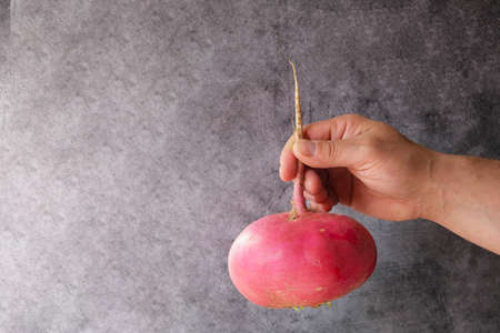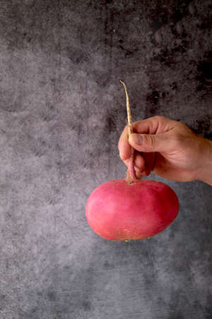 Ripe red radish in strong male hands on a gray background. Funny, abnormal vegetable or food waste concept. Healthy organic vegetables. Close-up. Natural vitamins, food raw materials. Vertical photo.