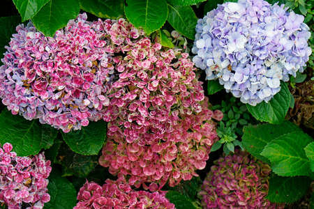 Beautiful bush of hortensia flowers. Closeup Hydrangea flower (Hydrangea macrophylla) blooming in spring and summer in a garden