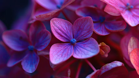 Extreme photograph showcasing a cluster of small flowers, likely hydrangea florets, characterized by intensely saturated shades of purple, violet, and magenta, with visible veining on the petals and small, bright blue central reproductive parts, set against a dark, moody background, emphasizing depth of field and vibrant color contrast.
