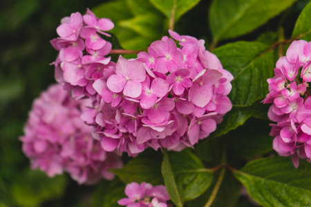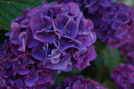 Beautiful purple flowers that bloomed in early summer. Hydrangea flower blooming in spring and summer in a garden. Close-up purple hydrangea or hortensia flower.
