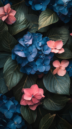 Vibrant hydrangea flowers in blue and pink shades blossom surrounded by rich green foliage in a serene garden setting.