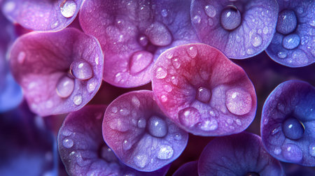 Purple Hydrangeas flowers with water drops background. Closeup of blossom with glistening droplets. Generative AI.
