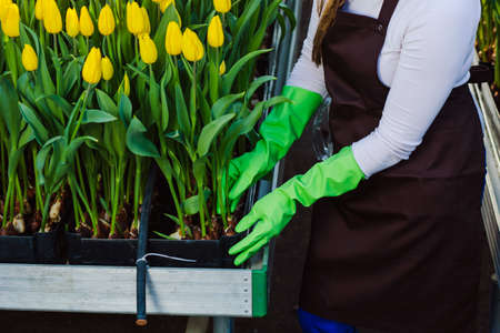 Gardener takes care of tulips, close-up of hands, wearing gloves.Tulip Hydroponically, in greenhouse, Industrial cultivation of flowers