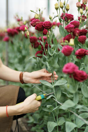 Woman hands close up picking red flowers in the green house. She cut flowers preparing a delivery