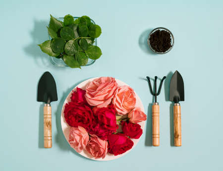 Gardener's dinner. Roses on a white plate, roses leaves and soil in glass pots, surrounded with shovel, spade and rake lay down on the table, on a blue background. Minimial gardening creative concept