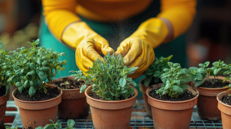 A person wearing gloves carefully attends to herbs in black pots on a wooden table. The greenhouse is filled with greenery, highlighting a peaceful gardening moment.