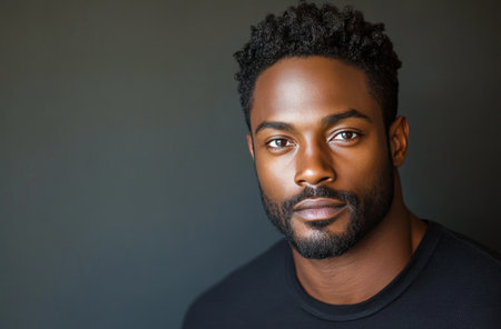 A man poses against a dark backdrop, showing a confident expression. His well-groomed hair and striking features highlight his charisma and presence.