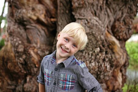 A portrait of a 6 year old, cute blond hair, blue eyed, boy child smiling outside in nature.