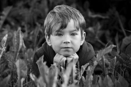 A portrait of a five-year-old boy lies in the grass. Black and white photo.