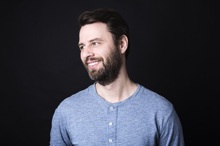 Portrait of a happy young man with beard smiling against gray background