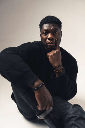 Attractive afro-american man posing in a studio isolated on a background, black and white image