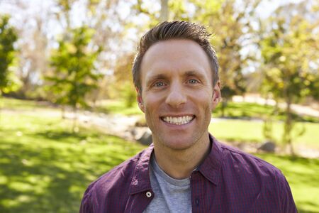 Happy white adult man in park looking to camera, close up