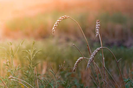 Sunset or sunrise in an agricultural field with ears of young golden wheat
