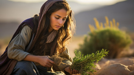 Young beautiful Bedouin woman collecting herbs and roots in desert areas.