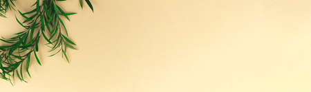 Green dried flower banner with beige color background, copy space, floral flat lay concept photo
