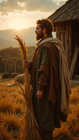 Man at dawn on antique threshing floor with wheat sheaf