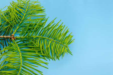 Fir tree branches on blue backgrund. Top view.