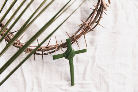 Palm cross on green palm leaves with crown of thorns over white fabric background, symbolizing Christian faith, Palm Sunday, sacrifice, Easter reflection, minimal religious concept with copy space.