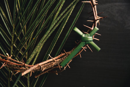 Palm leaf cross attached to crown of thorns green palm leaves on dark background symbolizing Christian faith Palm Sunday sacrifice Easter reflection religious concept for worship prayer church design
