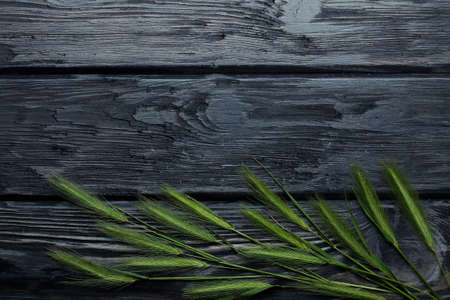 Field green grass on dark textured wooden background, copy space