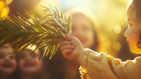 Child's Hand Holding Olive Branch in Sunlight with Smiling Friends Nearby. Concept of Peace, Friendship, Childhood Joy, Golden Hour, Warmth.