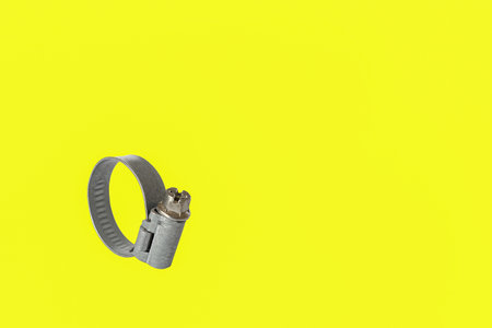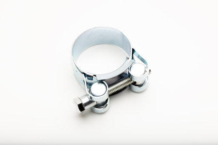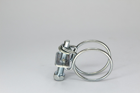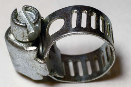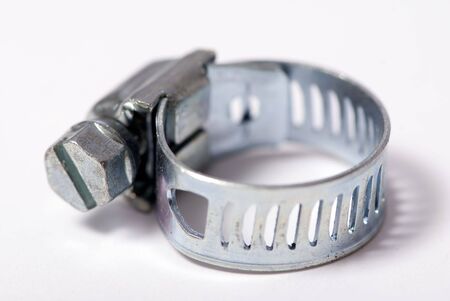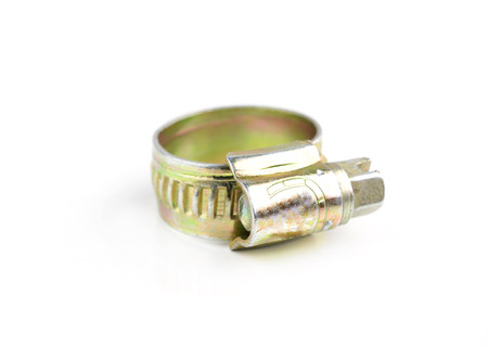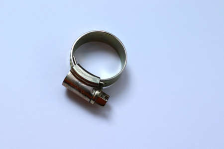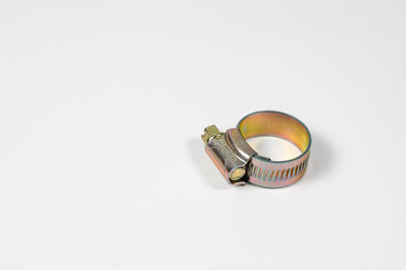 Metal hose strap for tighten rubber hose with copy space isolated on white background closeup.