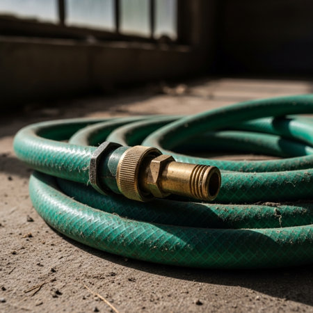 Coiled, dusty green garden hose with a worn brass nozzle, shot with a dynamic Dutch angle.