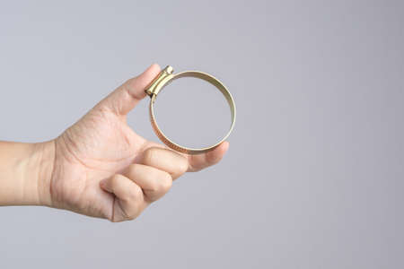 Metal hose clamps in hand isolated on white background closeup.