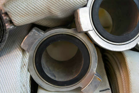 the fire hoses are in the fire truck compartment, fire hose connection heads close up