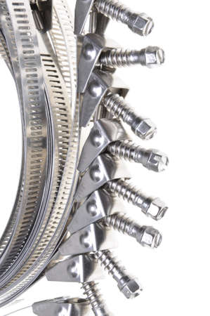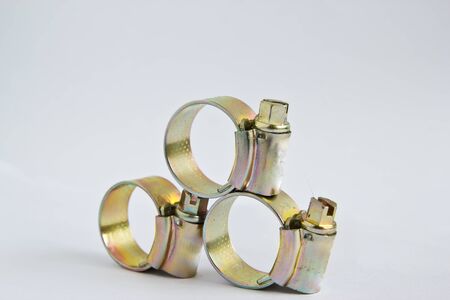 Metal hose clamps isolated on white background closeup.