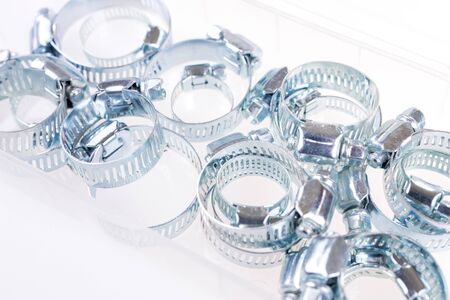 Different many metal clamps for hose connection in the plastic box