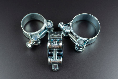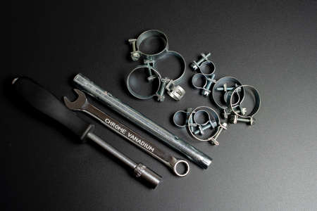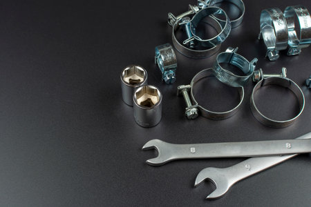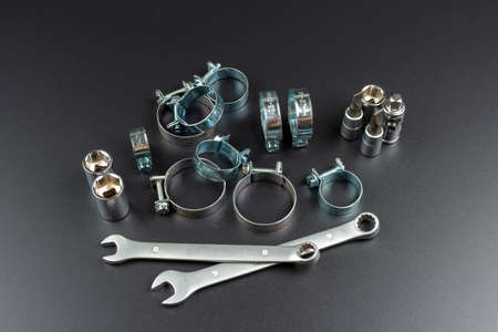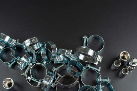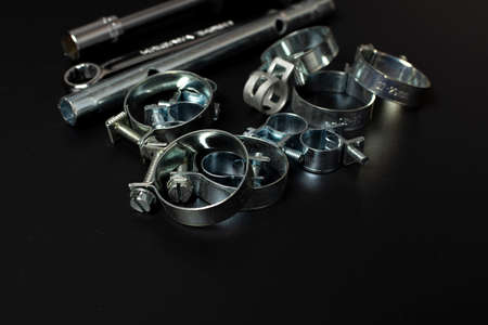 clamps for securing rubber pipes and tool on a black background