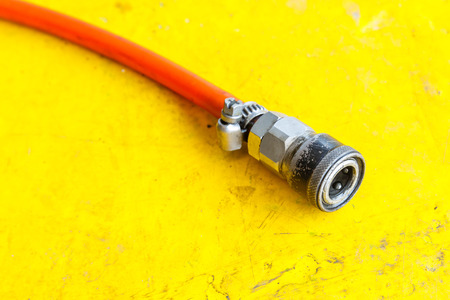 Close up old and dirty air hose connectorn in garage, automotive service station