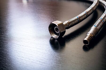 Metal water pipes on a wooden table, copy space