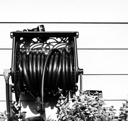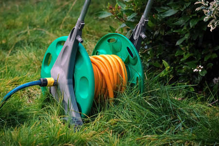 A reel with a wound hose for irrigation with water in the garden and vegetable garden. Agriculture. Farm. Irrigation system. Watering fruits and vegetables with water. Background image. Technology.