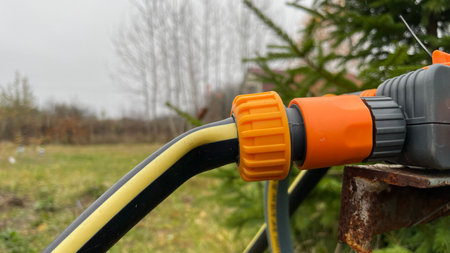 Plastic and metal garden hose fittings used for watering a vegetable garden