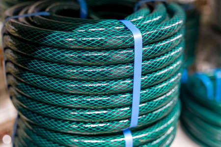 New Rubber watering hoses. Pile of new colorful coils of polymer hoses for watering, garden tools in stock on display case for sale. Stack of pvc pneumatic flexible reinforced hoses in a shop