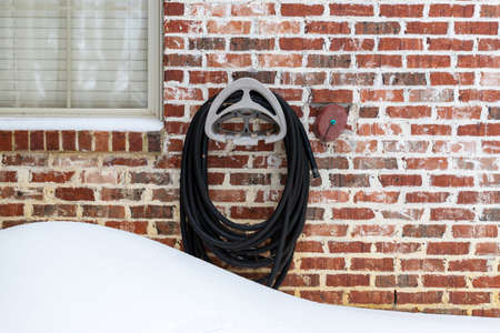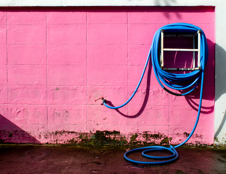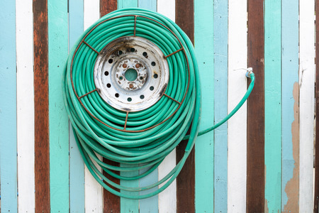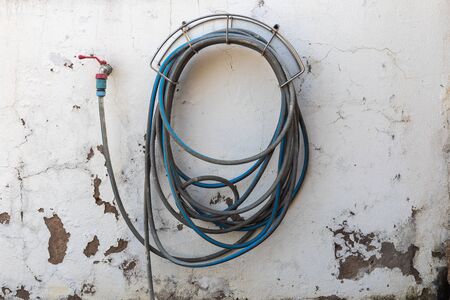 Bright watering garden hose in a backyard of a house. Blue Garden Water Hose Hanging on a wood in garden. Nobody, street photo, selective focus