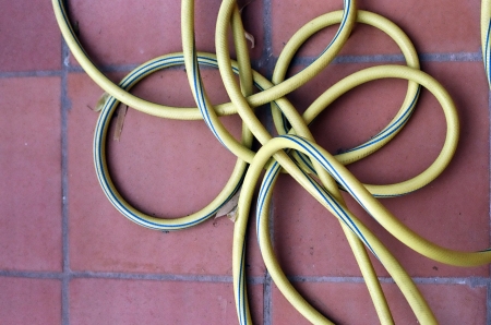 Yellow garden hose for watering lying in a floor curled in the corner.