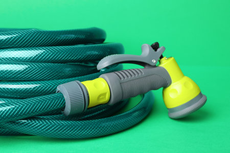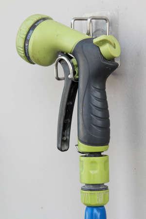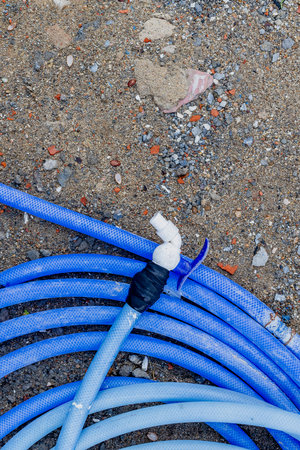 close up of watering hose lies on the grassy ground. blue rubber tube with device for spraying and watering plants in the garden. selective focus