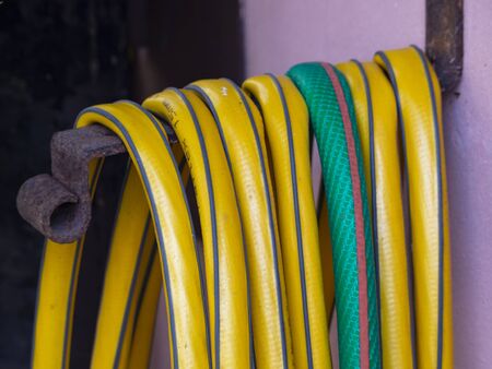 Stack of garden hoses. Variety of watering hoses stacked against the wall. Local market. Side view. Selective focus.