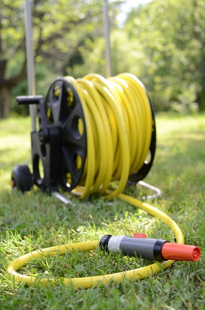 Yellow garden hose coiled on dry ground with green plants nearby. The concept represents maintenance, environment, and everyday practicality