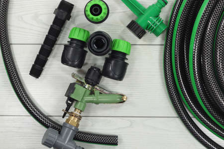 Irrigation fittings are different. Plastic connectors, hose couplings, garden spray guns for water, accessories equipment for watering.